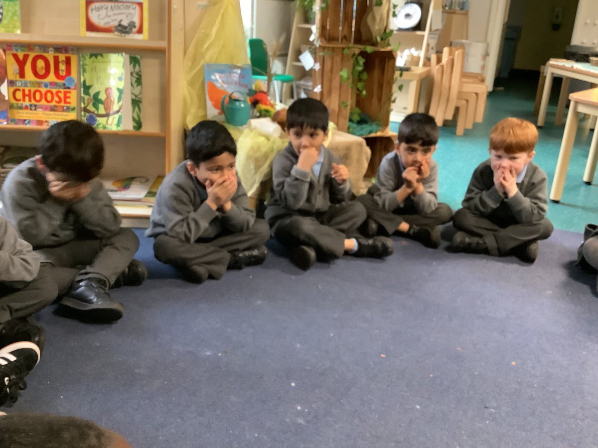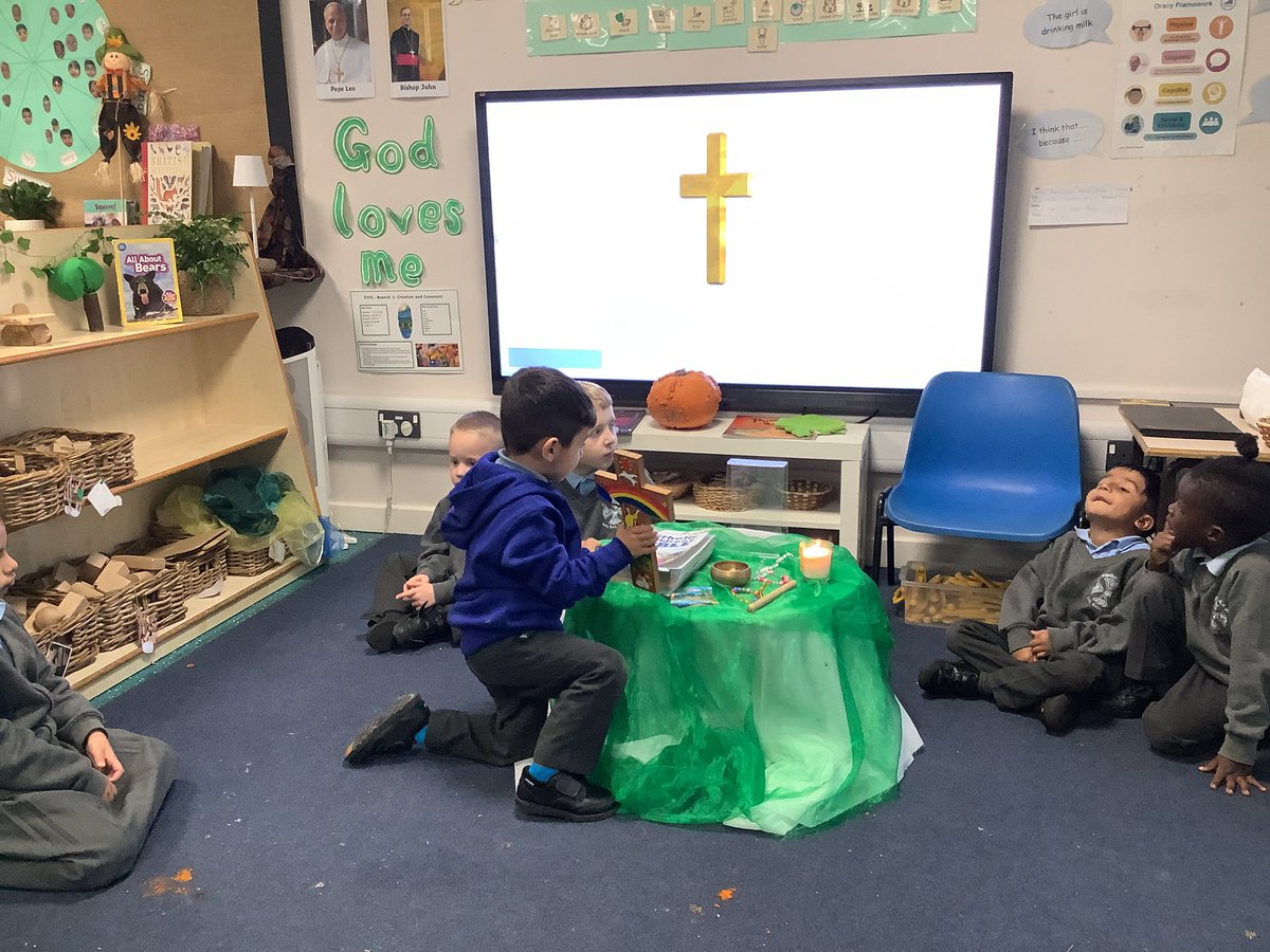 Celebration of the Word - Reception listened to the story about Jesus and the 10 lepers. We thought about the things we could say thank you to God for; our families, food to eat, our friends. #stethre #makingchristknown @STOC_CAT